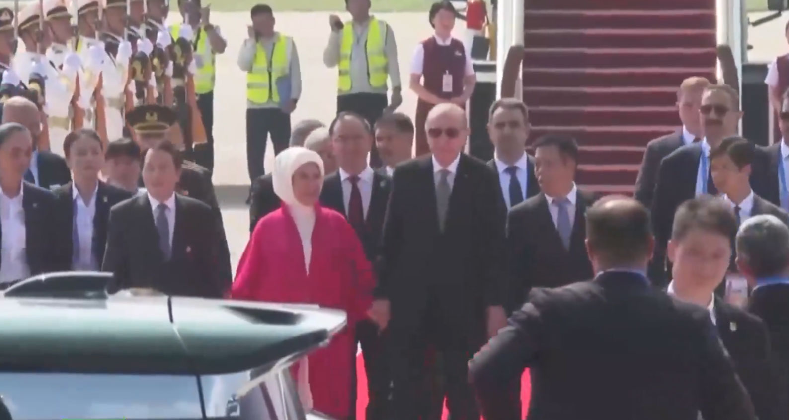 Erdogana su na međunarodnom aerodromu Binhai dočekali kineski ministar Lei Haichao, turski ambasador u Pekingu Selcuk Unal i osoblje ambasade.
