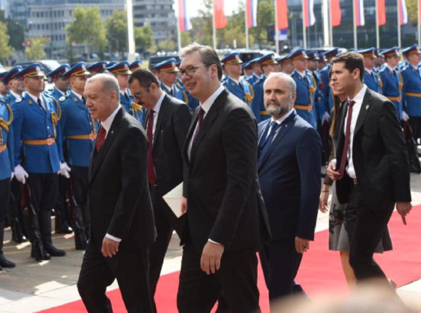 Turskog je šefa države u beogradskoj zračnoj luci “Nikola Tesla” dočekao predsjednik Aleksandar Vučić, potom je ispred Palače “Srbija” Erdoganu priređen i službeni svečani doček uz intoniranje himni dviju države te počasni plotun Vojske Srbije, kojim je označen službeni početak posjete turskog predsjednika Srbiji.