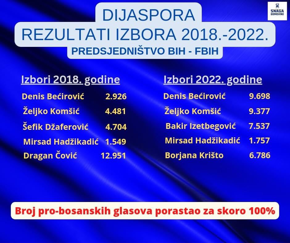 Na izborima koji su održani 2018. godine probosanske snage nisu imale svog kandidata ili kandidatkinju. Tada je za antibosanske kandidate stiglo iz dijaspore 29.403 glasova. Na ovim izborima je broj njihovih glasača višestruko umanjen. Samo 9.964 je dalo podršku tim snagama. Na drugoj strani kandidat ispred Pokreta za Državu je dobio 10.973 glasa. To je najbolji rezultat ne samo u Entitetu RS nego i na nivou čitave države.
