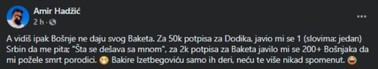- A vidiš ipak Bošnje ne daju svog Baketa. Za 50 hiljada potpisa za Dodika, javio mi se 1 (slovima: jedan) Srbin da me pita: "Šta se dešava sa mnom", za 2.000 potpisa za Baketa javilo mi se 200 Bošnjaka da mi požele smrt porodici. Bakire Izetbegoviću samo ih deri, neću te više nikad spomenut - naveo je Hadžić.