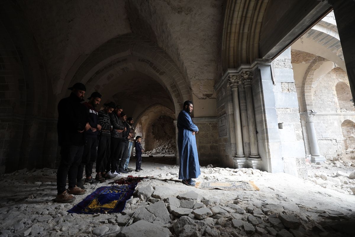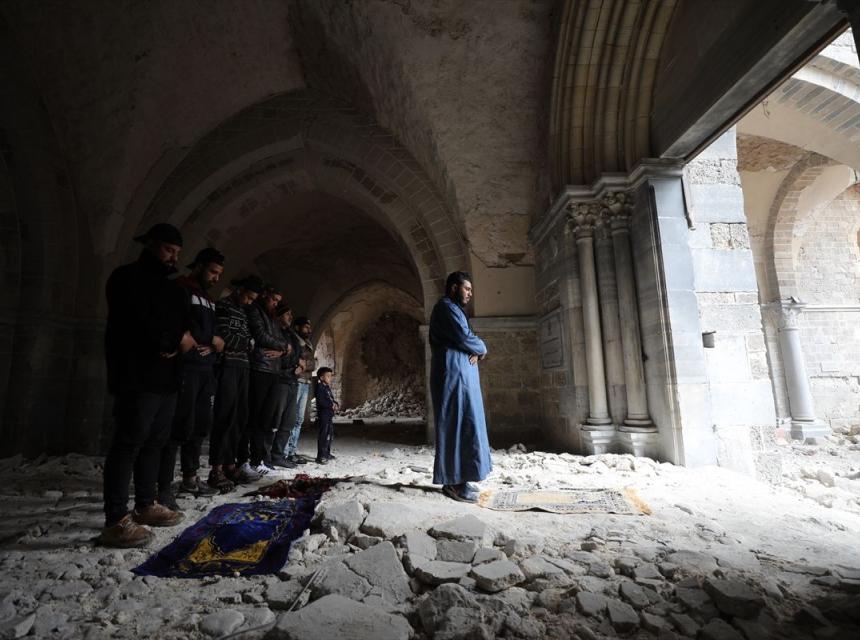 Imam Fadi Arif nastavlja da uči ezan, poziv muslimanima na molitvu, u ovoj džamiji u Gazi. Mali broj vjernika je uz imama i klanjaju namaz na ruševinama u džamiji.