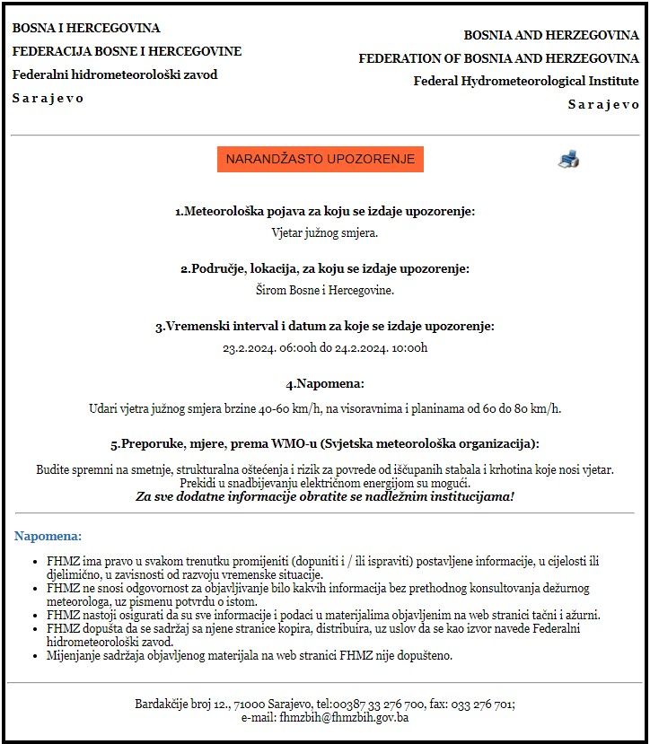 Upozorenje je na snazi od 23.2.2024. od 06:00 sati do 24.2.2024. do 10:00 sati.