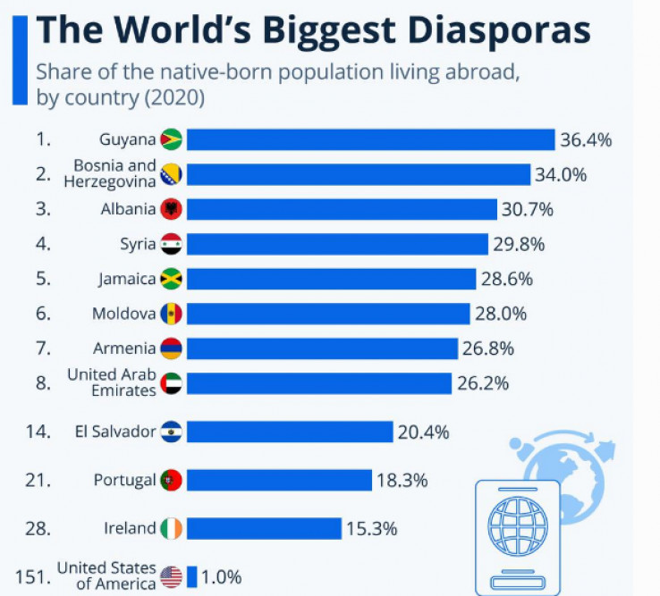36,4 posto Gvajananaca živi u inostranstvu, dok 30,7 posto Albanaca van svoje države.