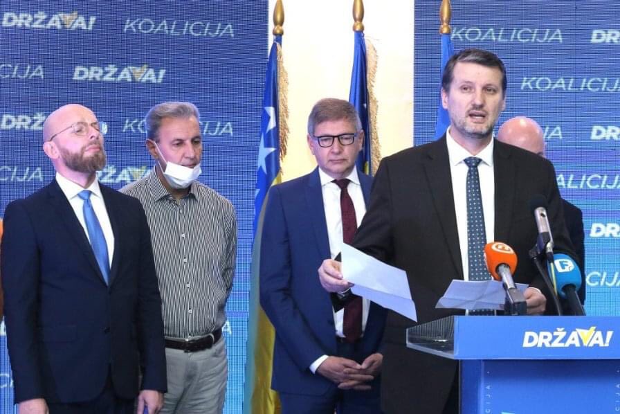 Koalicija Država! ozvaničena je danas u Sarajevu javnom promocijom i potpisivanjem koalicionog Manifesta. Ovu koaliciju zasada čine Platforma za progres, Nezavisni blok, pokret Red kojeg zastupaju nezavisni parlamentarci i vijećnici, Posavska stranka, Pokret Valter iz Tešnja, kao i drugi ugledni profesori, privrednici i nezavisni intelektualci, a otvorena je za sve koji prihvataju principe, vrijednosti i ciljeve koalicije.