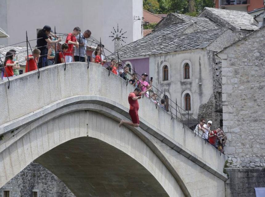 Nakon konferencije za medije šampion mostarskih skokova Ermin Sarić izveo je skok povodom 16. godišnjice obnove Starog mosta.