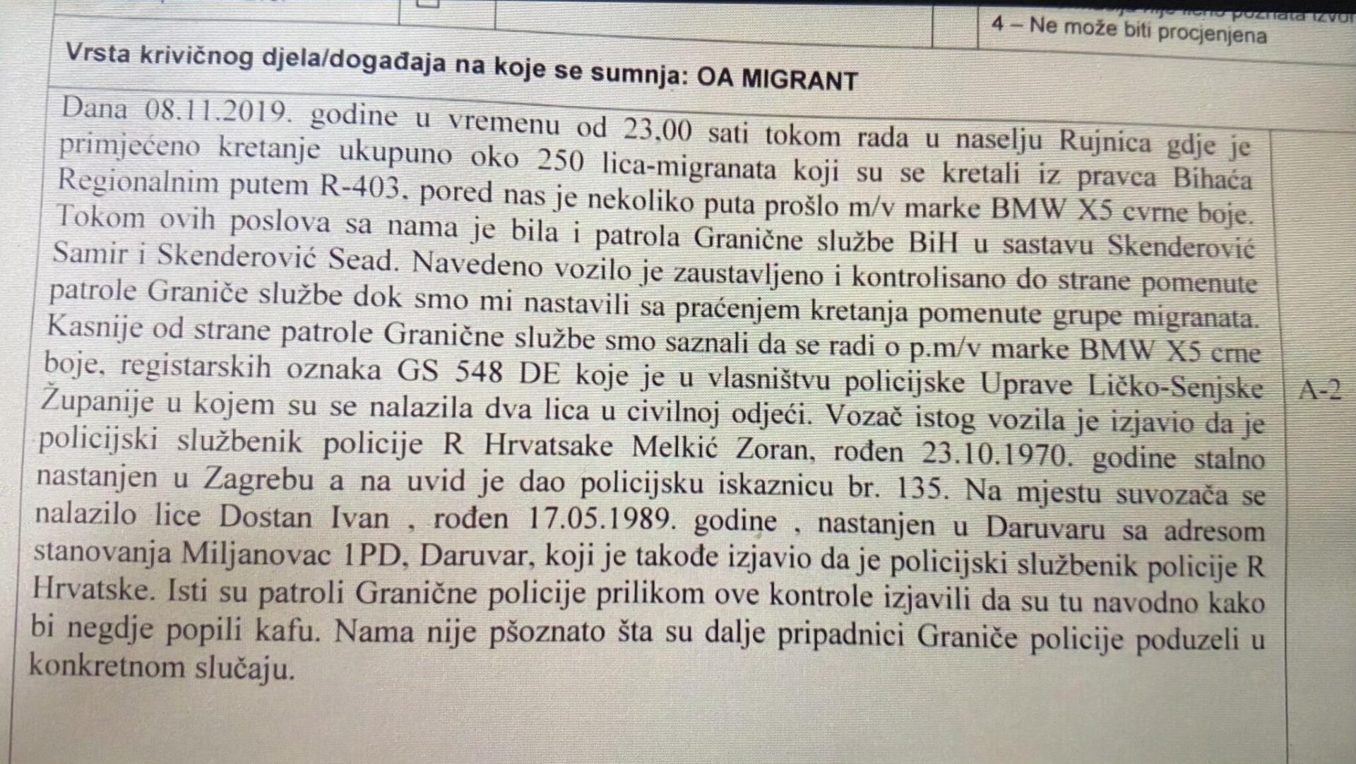 MUP USK-a redovno je o ovome obavještavao Graničnu policiju BiH ali nikada nisu poduzeti konkreti koraci kojim bi hrvatska policija bila spriječena da migrante ilegalno ubacuje na teritoriju BiH. Štaviše, Granična policija BiH je “puštala” pripadnike MUP-a Republike Hrvatske da nesmetano djeluju na teritoriji BiH o čemu svjedoči i ova službena zabilješka.