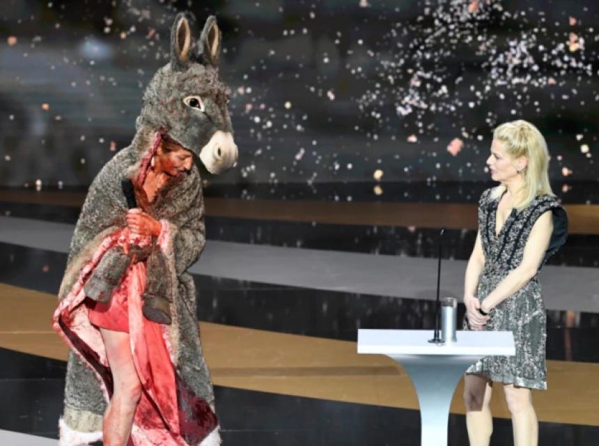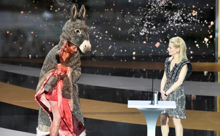 Glumica Korin Masiero (Corinne) je trebalo da preda nagradu za najbolji kostim, a sama je bila u kostimu magarca s tamponima kao minđušama, piše Radio Slobodna Evropa.