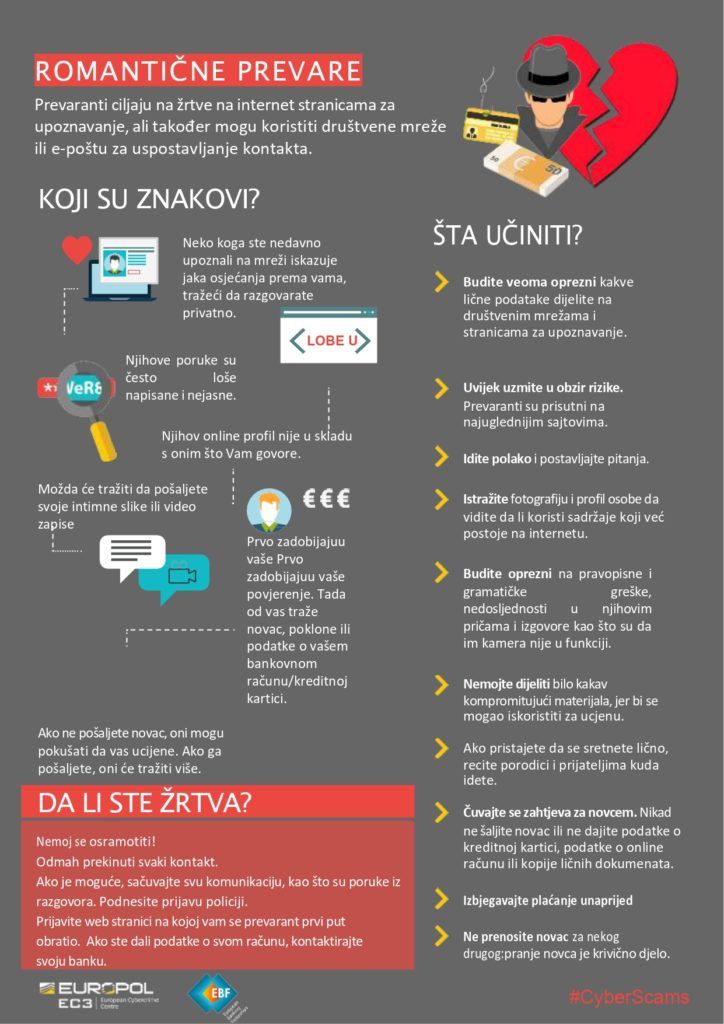 Federalna uprava policije želi upozoriti građane da je u prethodnom periodu zaprimljeno više prijava koje se odnose na izvršenje krivičnog djela prevare iz člana 294. KZ FBiH, tzv. “Romance Scam”, gdje napadač, koristeći aplikacije za upoznavanje i društvene mreže, uspostavlja kontakt sa žrtvom, te se isti nastavlja u smjeru uspostavljanja emotivne veze posredstvom interneta, a potom koristeći različite tehnike prevara od žrtve zahtijeva uplatu različitih iznosa novčanih sredstava, uz obećanje povrata novca u istom ili mnogo većem iznosu novca od uplaćenog.