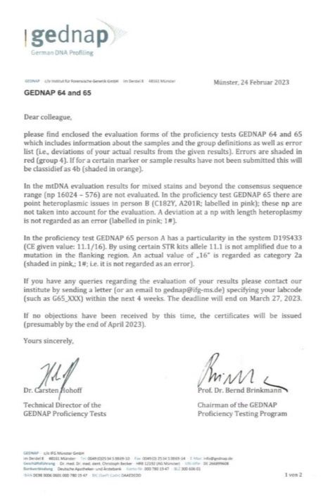 Odsjek za DNK istraživanja i vještačenja, Centra za forenzička ispitivanja, vještačenja i istraživanja, Federalne uprave policije još jednu godinu za redom je učestvovao i uspješno položio GEDNAP test ispitivanja stručnosti (eng. Proficiency testing), što potvrđuje činjenicu da je navedeni Odsjek jedan od evropskih forenzičnih laboratorija, koji je certificiran od „Njemačke udruge za kontrolu kvalitete rada forenzičnih laboratorija u Evropi“.