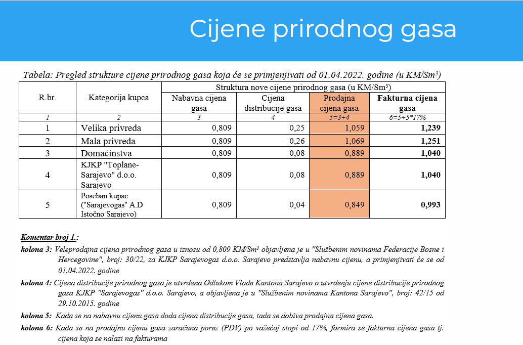 - Vlada Federacije BiH na sjednici održanoj 14.04.2022.godine donijela je Odluku o davanju saglasnost na veleprodajnu cijenu prirodnog gasa za distributivna privredna društva na području Federacije BiH, a koja će se primjenjivati od 01.04.2022.godine. Nova cijena iznosi 809 KM/1000 Sm3, odnosno 0,809 KM/Sm3 - saopćeno je iz Sarajevogasa.