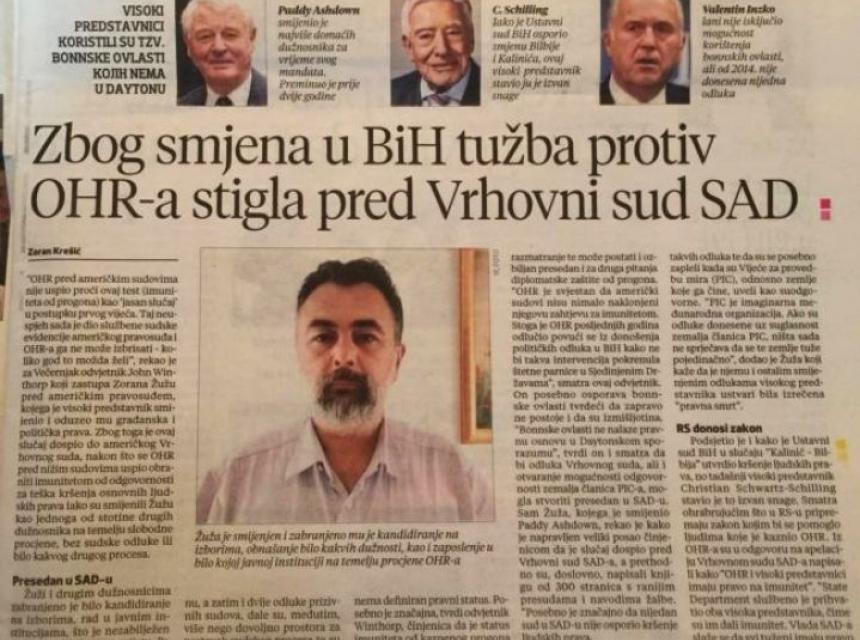 Večernji list, u štampanom izdanju za BiH od 05.02.2020., objavio je članak u kojem se tvrdi da bi Vrhovni sud SAD mogao, zbog kršenja ljudskih prava, umanjiti nadležnosti i poništiti ranije odluke Ureda visokog predstavnika u BiH, uključujući smjenu Zorana Žuže, bivšeg šefa kabineta Predsjednika Skupštine RS.