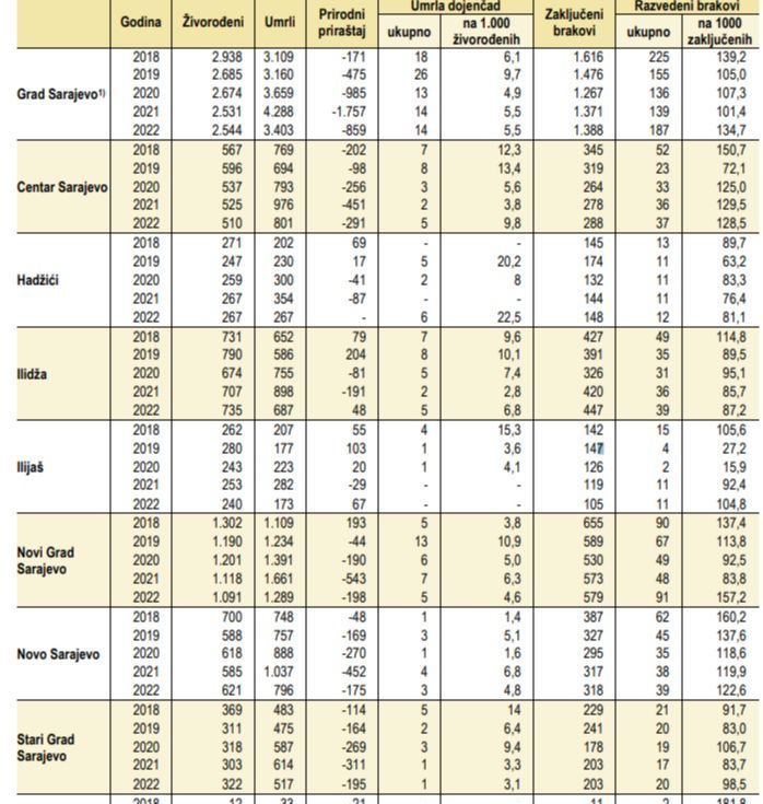 Četiri gradske općine iz godine u godinu akumuliraju nekoliko stotina više umrlih nego rođenih. Rekordna u tom smislu je bila 2021. godina, kada je u Sarajevu čak 1.757 ljudi više umrlo nego što ih je rođeno.