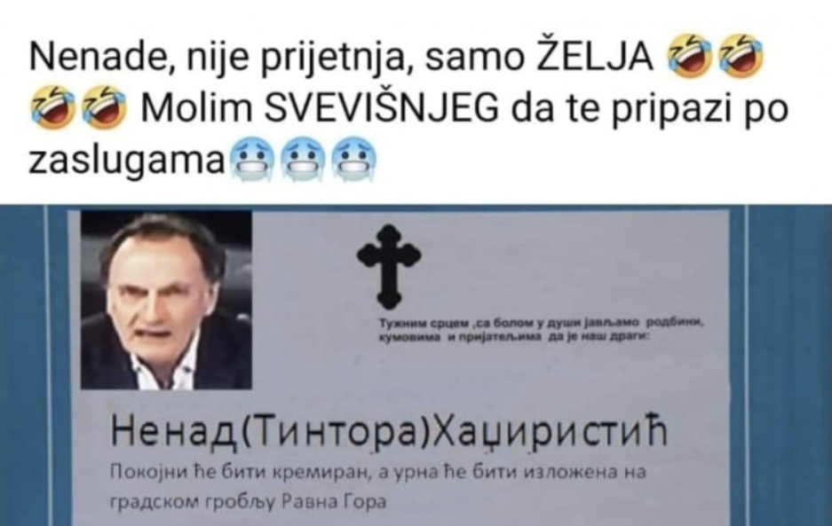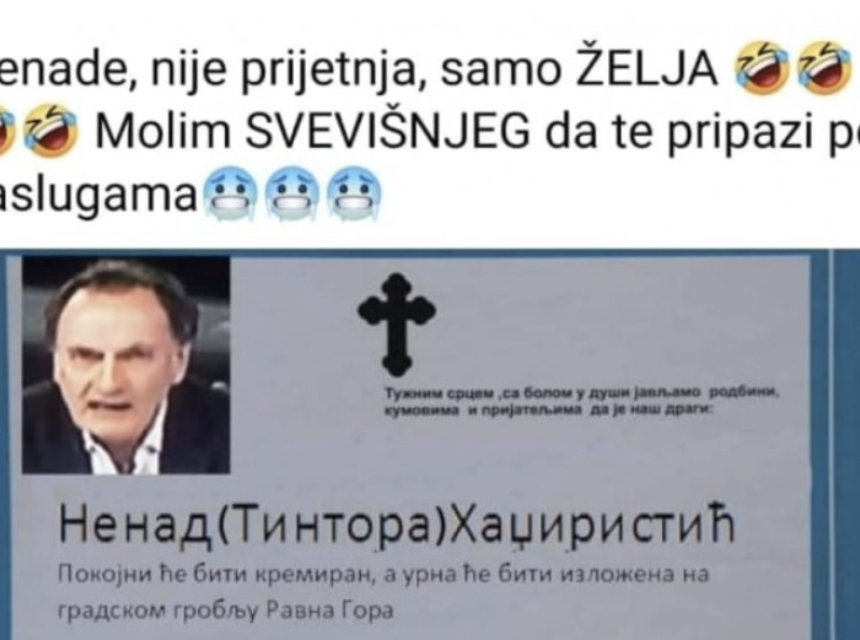Još gnusniju poruku Drina je Hadžifejzoviću uputio preko društvene mreže kada je objavio njegovu fotografiju montiranu na smrtovnicu sa veoma uvrijedljivim sadržajem.