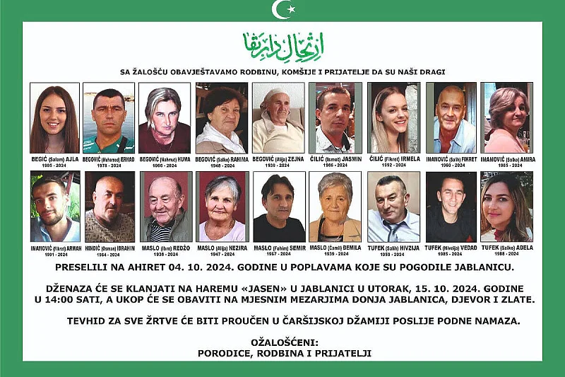 Radi se o poginulima: Begić (Salem) Ajla 1995-2024., Begović (Muhamed) Ernad 1978-2024., Begović (Mahmut) Huma 1966-2024., Begović (Salko) Rahima 1948-2024., Begović (Alija) Zejna 1939-2024., Čilić (Ismet) Jasmin 1986-2024., Čilić (Fikret) Irmela 1992-2024., Imamović (Salih) Fikret 1960-2024., Imamović (Salko) Amira 1965-2024., Imamović (Fikret) Arman 1991-2024., Hindić ( Osman) Ibrahim 1964-2024., Maslo (Ibro) Redžo 1938-2024., Maslo (Alija) Nezira 1947-2024., Maslo (Fehim) Semir 1967-2024., Maslo (Ćamil) Đemila 1939-2024., Tufek (Salih) Hivzija 1959-2024., Tufek (Hivzija) Vedad 1975-2024., Tufek (Salko) Adela 1988-2024.