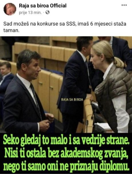 - Seko gledaj to malo i sa vedrije strane. Nisi ti ostala bez akademskog zvanja, nego ti samo oni ne priznaju diplomu – opis je na jednoj fotografiji na kojoj je prikazano kako premijer Vlade FBiH Fadil Novalić razgovara sa Sebijom.