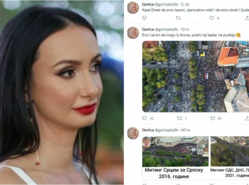 Gorica Dodik, kćerka Milorada Dodik,a člana Predsjednišva BiH i predsjednika SNSD-a posvetila je nekoliko tvitova današnjim protestima u Banjoj Luci.