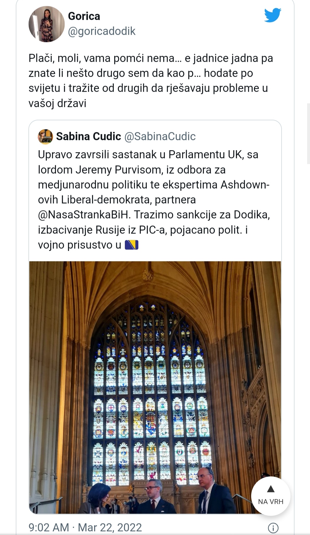 - Upravo završili sastanak u Parlamentu VB, sa lordom Džeremijem Purvisom (Jeremy) , iz odbora za međunarodnu politiku te ekspertima Ashdownovih Liberal-demokrata, partnera Naše stranke u BiH. Tražimo sankcije za Dodika, izbacivanje Rusije iz PIC-a, pojačano političko i vojno prisustvo u Bosni i Hercegovini - poručila je Ćudić.