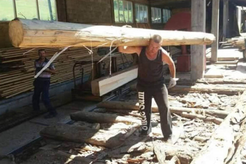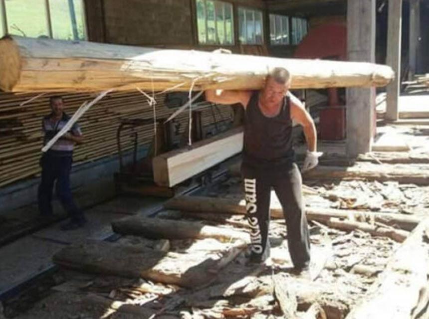 Muškarac zavidne snage na ramenima nosi ni manje ni više nego balvan.