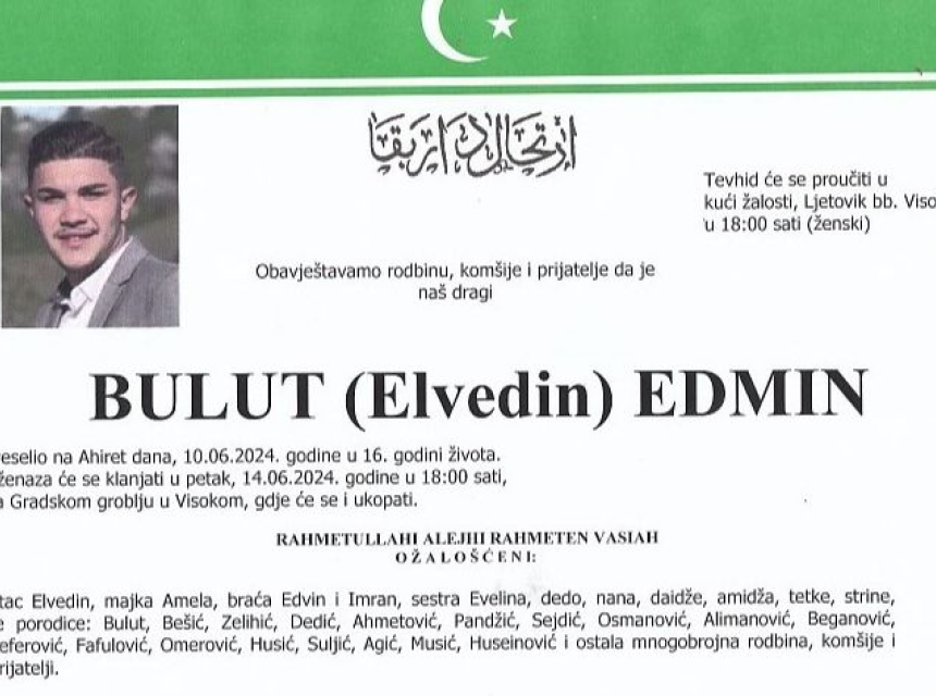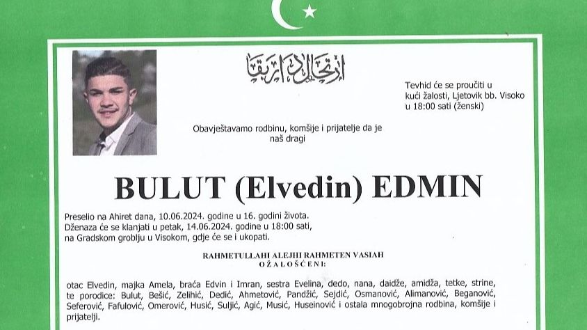 Edmin Bulut iz Visokog preminuo je u 16. godini. Tinejdžer je preminuo 10. juna, a dženaza će mu biti klanjana u 18 sati na Gradskom groblju u Visokom, gdje će biti obavljen i ukop.