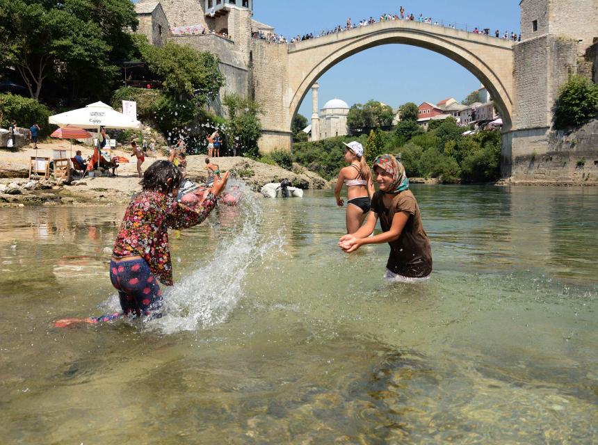 Iako su mostarske gradske ulice puste, stara gradska jezgra Mostara je prepuna turista i građana koji traže osvježenje u Neretvi koja danas nije dovoljno ni ledena.