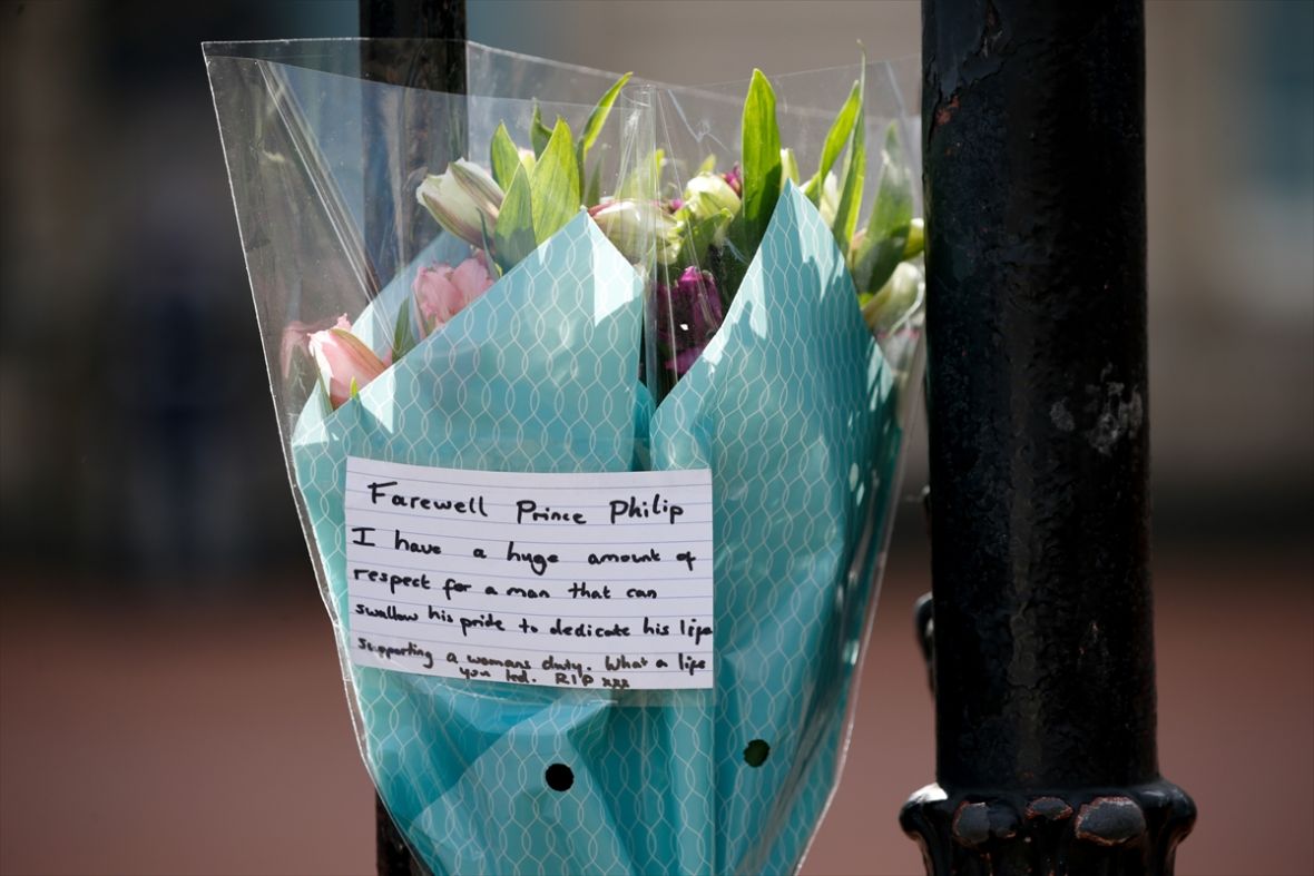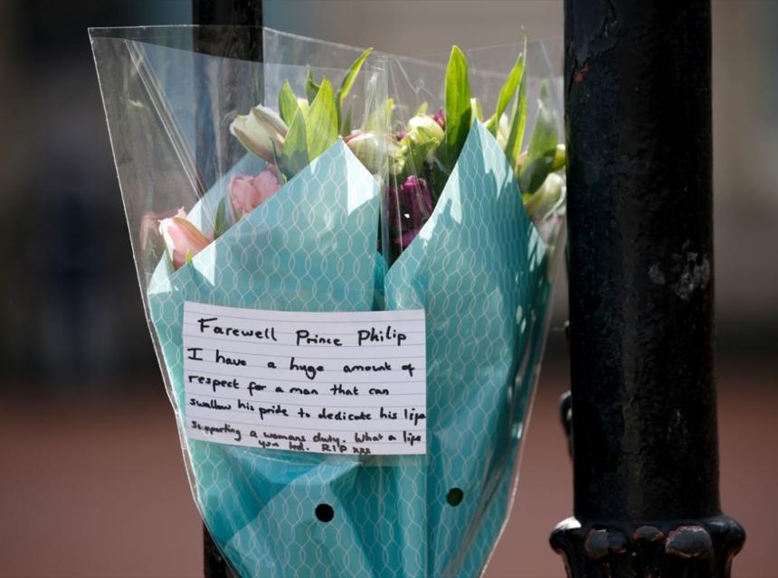 Mnogobrojni građani ostavljaju cvijeće i odaju počast britanskom princu Philipu ispred Buckinghamske palate u Londonu u Velikoj Britaniji.