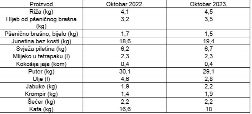 U odnosu na oktobar 2022. godine nivo cijena viši je za 2,1 posto, a hrana je skuplja za 4,9 posto. Poređenjem cijena osnovnih životnih namirnica evidentno je poskupljenje riže, hljeba, mesa, voća i povrća, kafe. Na istom nivou su ostale cijene mlijeka, jaja i šećera, dok su cijene brašna, putera i posebno ulja niže nego prije godinu.