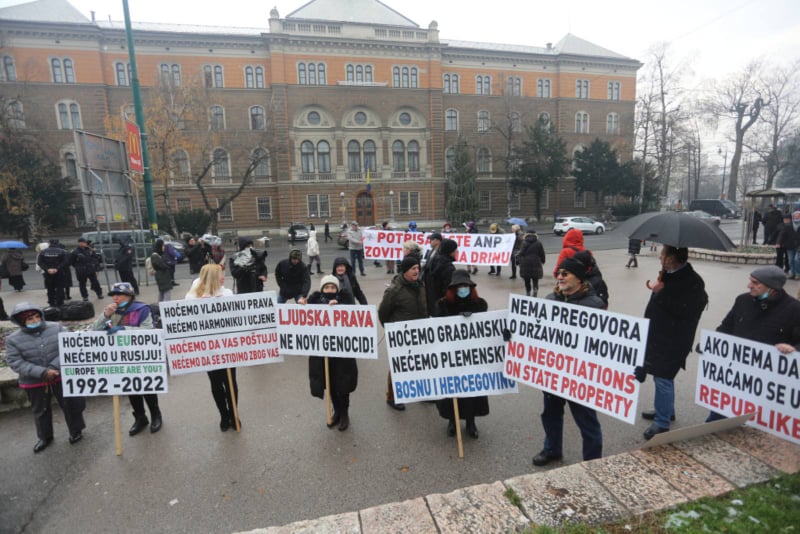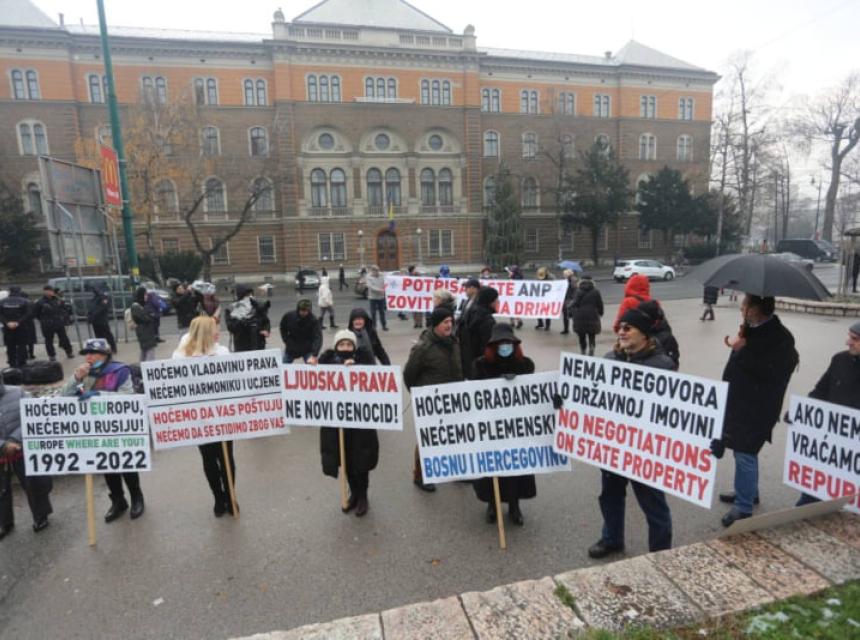 Okupljeni građani nosili su transparente sa jasnim porukama: "Ljudska prava, ne novi genocid", "Hoćemo u Europu, nećemo u Rusiju", "Zabrana političkog djelovanja za Dodika, Izetbegovića i Čovića", "Potpisali ste ANP, zovite NATO na Drinu", "Nema pregovora o državnoj imovini".