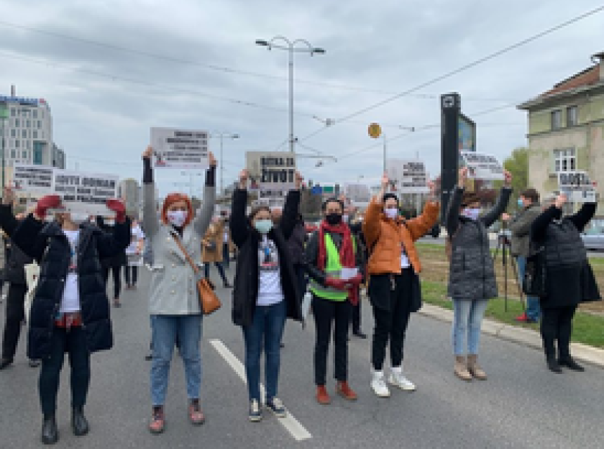 Građani su održali i minutu šutnje za sve one koji su preminuli od koronavirusa. Drže transparente s kojih poručuju: “Smjene svih odgovornih za smrt +7.500 umrlih. Konkretne mjere i rješenja”, “Idite odmah, dajte šansu da preživim”, “Paraziti, domaćin vam umire”, “I vlast i opozicija ubijaju sovje građane” itd.