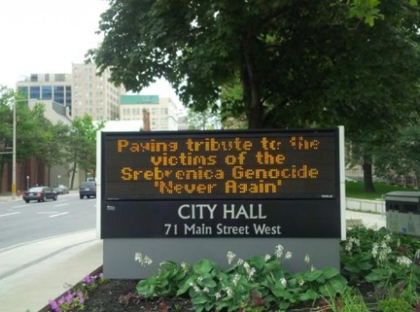 Na elektronskom panou ispred zgrade Skupštine je napisano: "11 juli Dan sjećanja na Srebrenički genocid u Hamiltonu. Odajemo počast žrtvama genocida u Srebrenici".