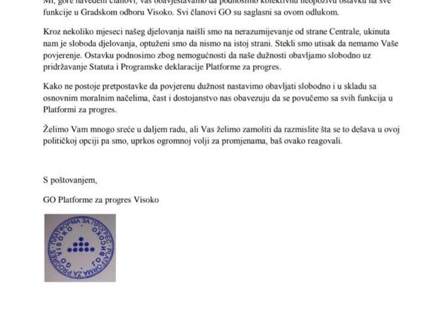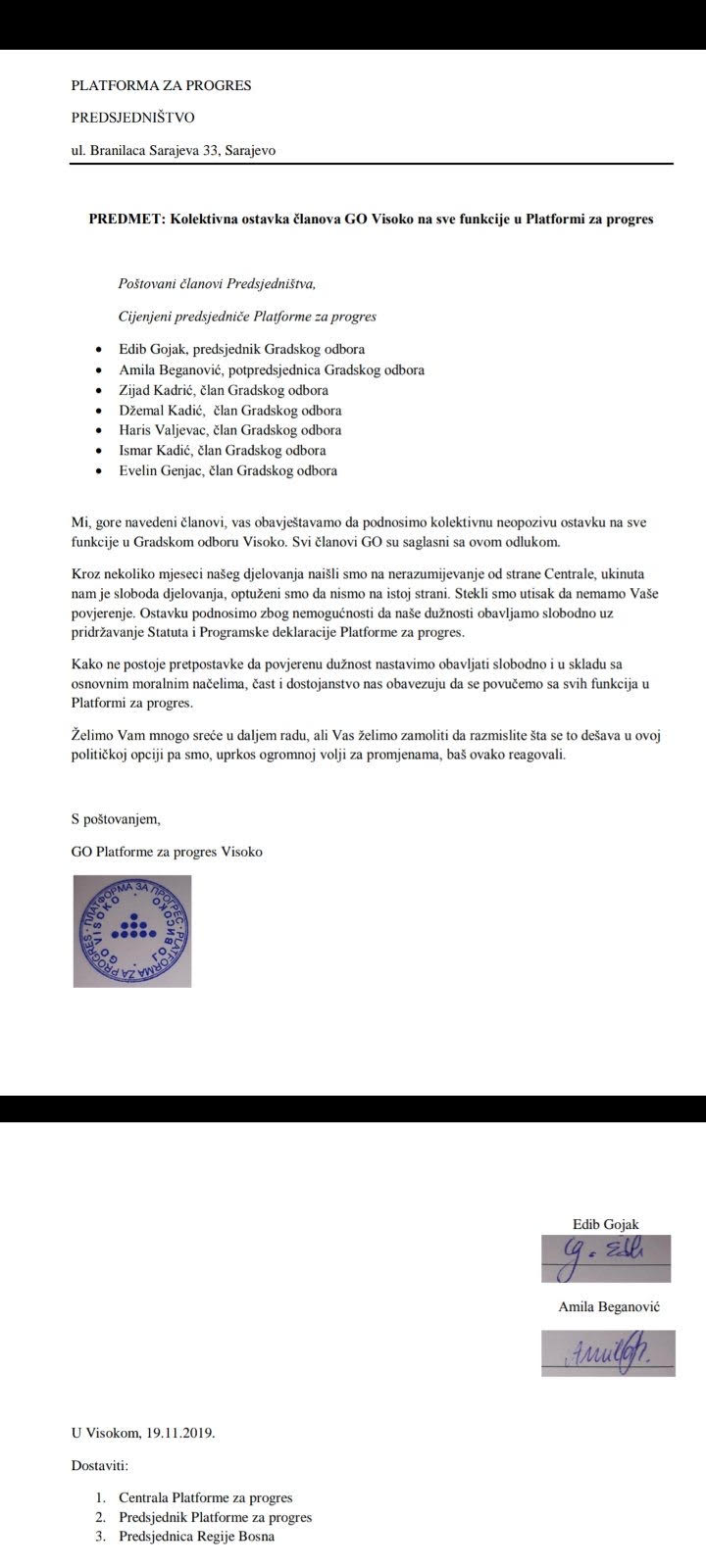 Danas je Gradski odbor stranke Mirsada Hadžikadića, Platforme za progres Visoko, kolektivno istupio iz stranke. ''Kroz nekoliko mjeseci našeg djelovanja naišli smo na nerazumijevanje od strane Centrale, ukinuta nam je sloboda djelovanja, optuženi smo da nismo na istoj strani.''- naveli su između ostalog 7 članova Gradskog odbora, na čelu sa Edibom Gojak. Nezvanično, saznajemo da je razlog za ovakvu odluku bio zahtjev od Hadžikadića da uklone neke medijske tekstove i stavove o dešavanjima u Visokom koje je lokalna organizacija objavila, a tiču se odnosa prema lokalnim predstavnicima drugih političkih stranaka. Očito, to nije se uklapalo u više planove koje je predsjednik Platforme Hadžikadić imao ili pravio sa nekim od njih i bez znanja članova svoje stranke iz te općine, što je i rezultiralo time da se, samo nakon nekoliko mjeseci od osnivanja i kolektivno raziđu i napuste tu stranku. Biće zanimljivo čuti i reakciju Centrale Platforme koja će vjerovanto imati svoju stranu priče, ali u svakom slučaju, ovo predstavlja težak udarac stranci, koja se tek pokušava formirati u nekim lokalnim sredinama u BiH.