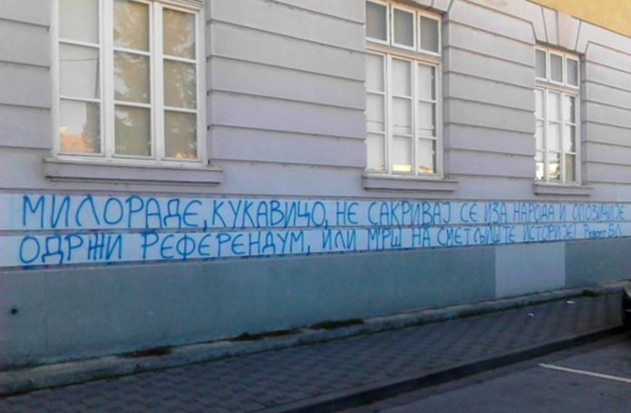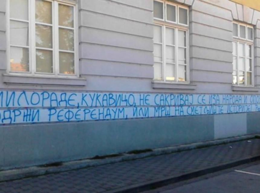 Na fasadi Katoličke gimnazije u centru Banjaluke osvanuo je grafit: Milorade, kukavico, ne sakrivaj se iza naroda i opozicije. Održi referendum ili m'rš na smetljište istorije!