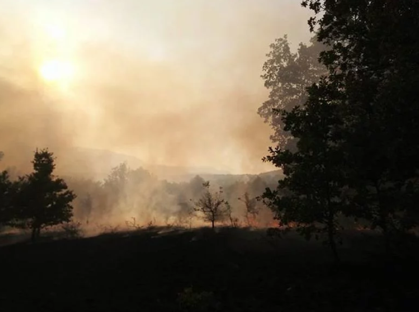 Vatrena linija se proteže na oko 100 metara, vidljiva iz centra, a na terenu su pripadnici lokalne vatrogasne jedinice.
