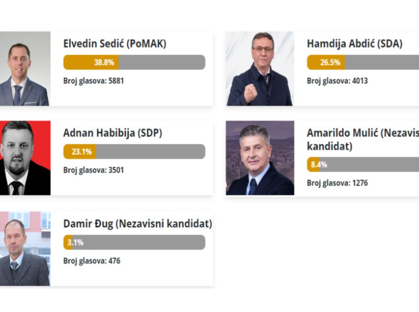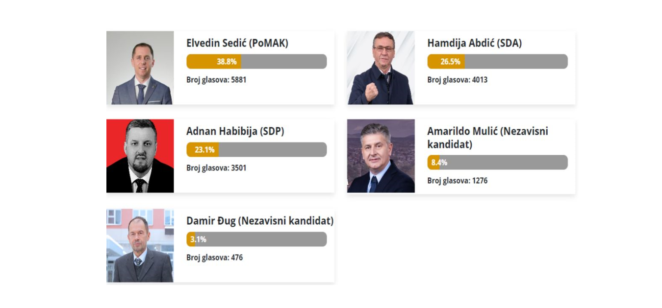 Prema nezvaničnim rezultatima Elvedin Sedić iz Pomaka ima 5.881 glas a drugi je Abdić sa osvojenih 4.013 glasova.