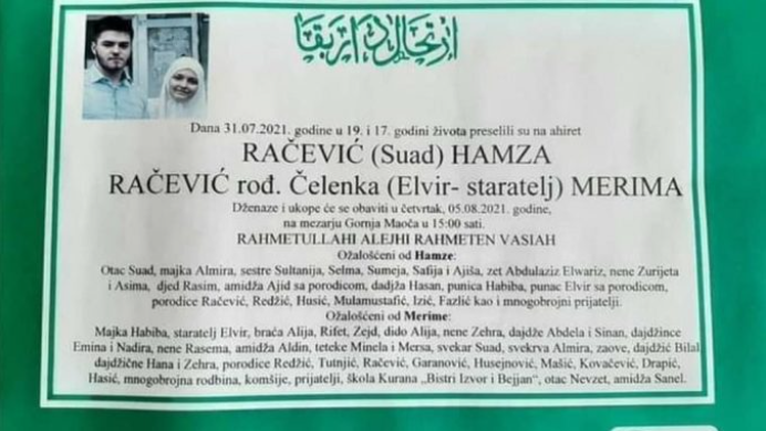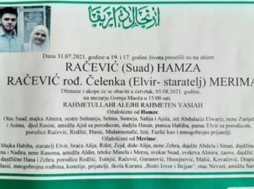 OBAVIJEST O SMRTI 14 Aug, 2021 - 22:40 / Uredio: Sandi / 0 Comments Hamza je imao 19, a Merima 16 godina: Neopisiva tuga nakon nesreće u kojoj je poginuo mladi bračni par Ovaj mladi bračni par je smrtno stradao u saobraćajnoj nesreći. Na jednom YouTube kanalu napisano je emotivno pismo za ovo dvoje mladih osoba. obavijest o smrti teška nesreća Related Articles OBAVIJEST O SMRTI 05 Dec, 2025 Na Ahiret preselila Prasko (Velid) Edina OBAVIJEST O SMRTI 05 Dec, 2025 Na Ahiret preselila Handanagić (rođ. Đurić) Esada–Enesa OBAVIJEST O SMRTI 05 Dec, 2025 Na Ahiret preselila Kapić (rođ. Abdić) Fatima OBAVIJEST O SMRTI 05 Dec, 2025 Na Ahiret preselila Nuhanović (Čazima) Sabina OBAVIJEST O SMRTI 05 Dec, 2025 Na Ahiret preselila Šabić (Gerzić) Ajka OBAVIJEST O SMRTI 05 Dec, 2025 Na Ahiret preselio Mureškić (Mujage) Izet