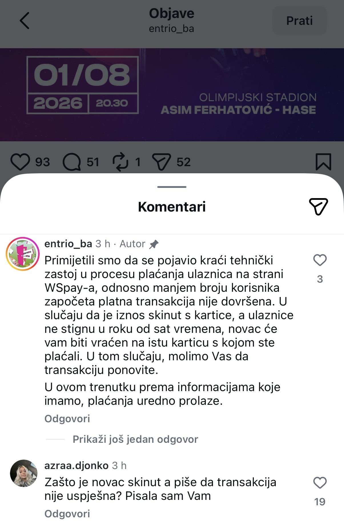 Ipak, reakcije fanova na društvenim mrežama pokazuju da je situacija bila daleko od idealne. Mnogi su naveli da su satima čekali u online redu, pokušavali više puta izvršiti uplatu, ali bez uspjeha. Pojedini tvrde da im je novac skinut, dok sistem prikazuje da transakcija nije uspješna, dok drugi ističu da kartice uopšte nisu prolazile.