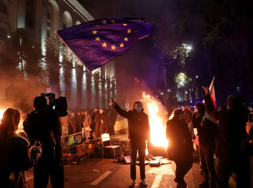 Hiljade ljudi ponovno su izašle na ulice Tbilisija večeras kako bi protestvovali protiv odluke vlade da suspenduje pristupne pregovore s Evropskom unijom "do kraja 2028.".