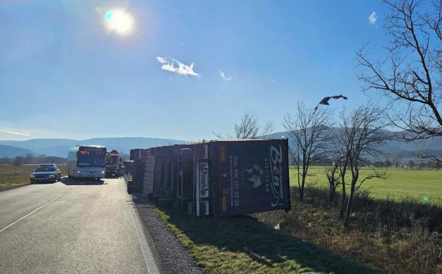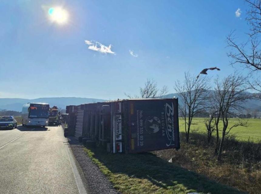 Usljed nevremena prevrnuo se i kamion sa prikolicom kojim je upravljao 23-godišnji vozač koji se od naleta prevrnuo na desnu stranu.