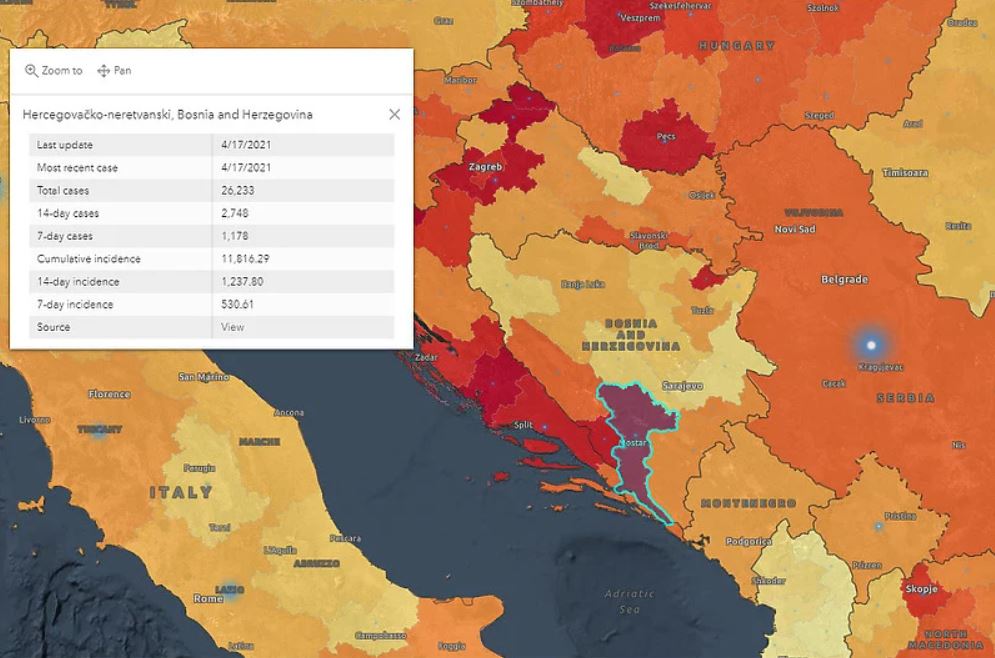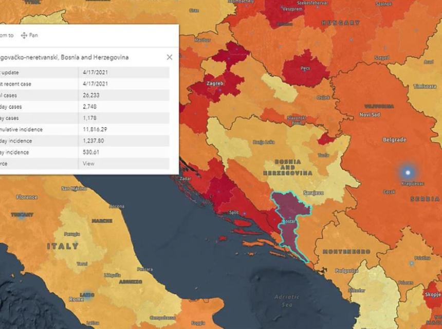 Pored ovih regija, u samom vrhu liste našao se i jedan dio Bosne i Hercegovine. Naime, Hercegovačko-neretvanski kanton trenutno se nalazi na petom mjestu po broju novozaraženih u Evropi sa incidencom od 531 slučaj zaraze koronavirusom.