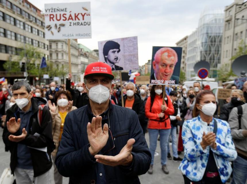 Česi su na protest pod parolom „Predsjednik je pretjerao“ donijeli češke i zastave Evropske unije. I transparente sa porukama „Mjesto nam je na Zapadu“. “Zeman izdajica”. Ili „Nismo Rusija, nismo roba“.