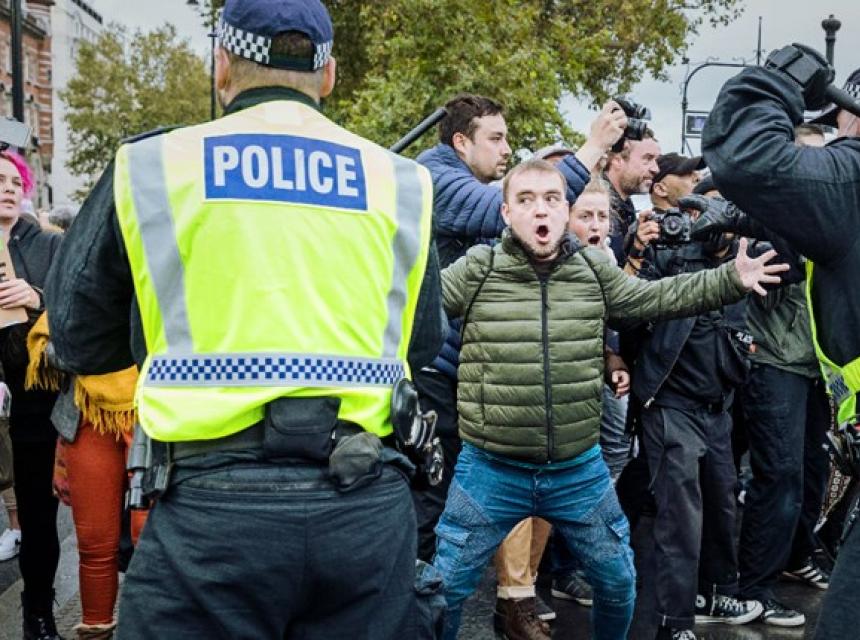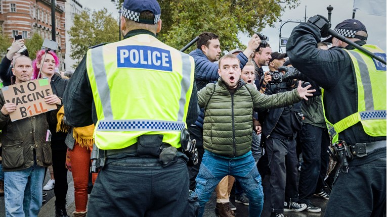 Naoružani policajci kasnije su rastjerali gomilu prosvjednika protiv karantene na Trafalgar Squareu. Barem dvije osobe policija je odvezla u lisičinama, izvijestila je PA.
