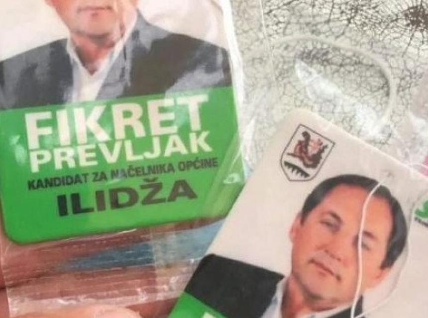 Na mirisu za automobile je istaknuta fotografija kandidata Stranke demokratske akcije (SDA) Fikreta Prevljaka, koji je kandidat za načelnika Općine Ilidža. Osim fotografije Prevljaka na mirisu se nalazi i općinski grb.