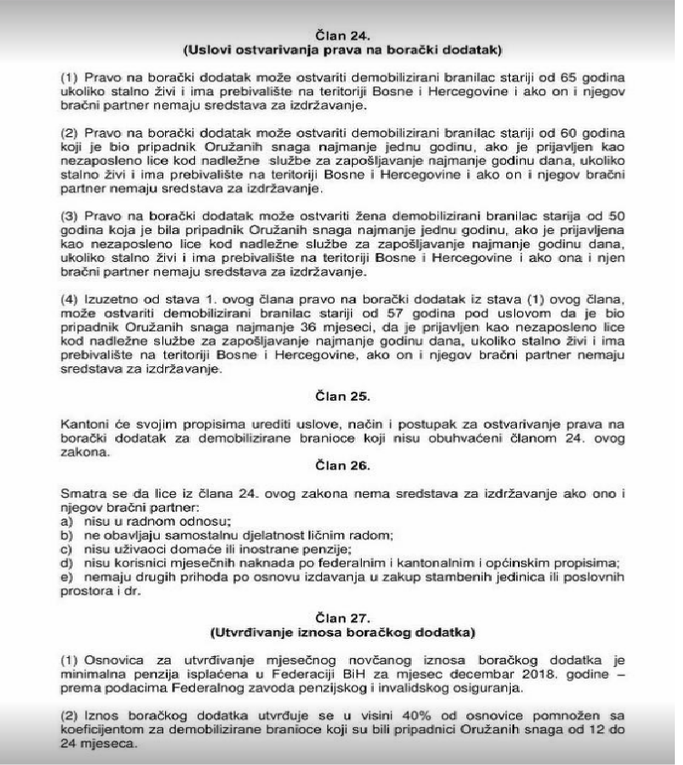 Prijedlog Zakona je u 24. članu predvidio ko sve ima pravo na sotvarivanje boračkog dodatka. Tako pravo na određeni iznos dodatka ima: