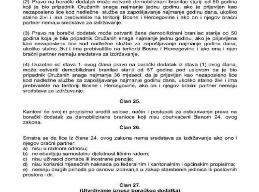- pravo na dodatak može ostvariti i demobilisani borac stariji od 57 godina, pod uslovom da je bio pripadnik Oružanih snaga najmanje 3 godine, da je trenutno nezaposlen, da živi u BiH te da on i njegova supruga nemaju sredstava za izdržavanje.