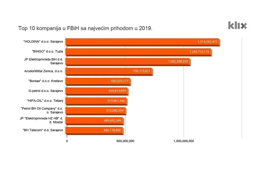 Prošla 2019. godina bila je uspješna za većinu najvećih kompanija u Federaciji BiH, a poredak ukupnom ostvarenom prihodu nije se značajno promijenio u odnosu na godinu ranije. Portal Klix.ba donosi vam zvanične podatke Finansijske-informatičke agencije (FIA) koje su danas objavile bonitetne kompanije LRC i Bisnode.