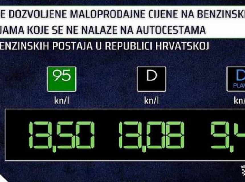 Izvan autocesta cijena eurosupera 95 tako će i dalje iznositi 13.50 kuna, a eurodizela 13.08 kuna. Na autocestama će se eurosuper 95 i u iduća dvije sedmice prodavati po cijeni od 14.57 kuna, a eurodizel za 14.06 kuna. Plavi dizel košta 9.45 kuna po litri.