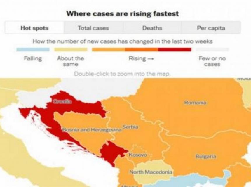Na mapi "New York Timesa" zemlje su klasifikovane prema stopi porasta broja novih slučajeva u poslednjih 14 dana, pa, iako pojedine imaju nizak broj zaraženih, računa se procenat porasta broja novooboljelih poslednjih dana.