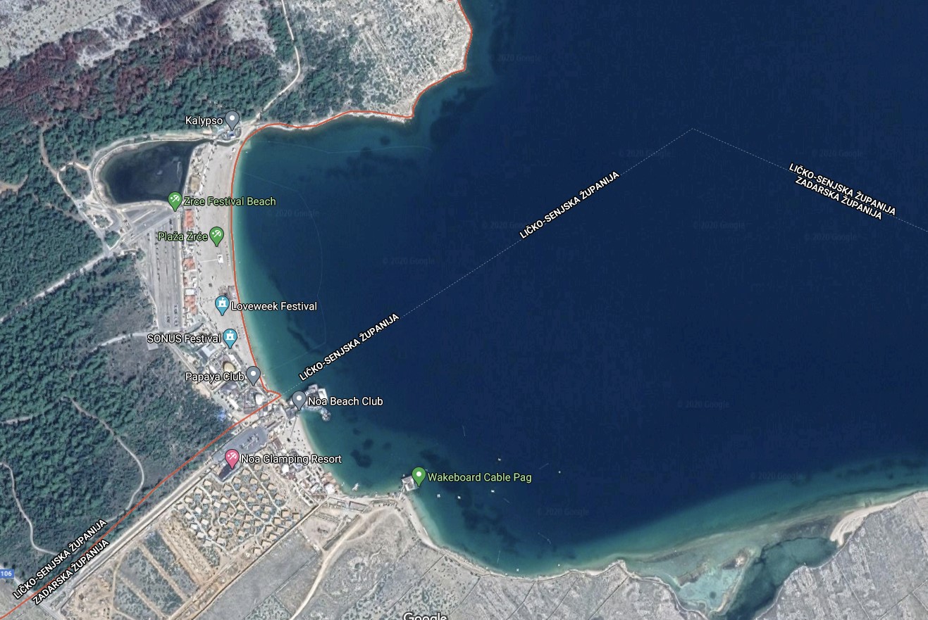 S druge strane, oni na Pagu imaju problem. Sjeverni dio otoka (Grad Novalja) nalazi se u Ličko-senjskoj, a južni (Grad Pag, Općina Kolan i Općina Povljana) u Zadarskoj županiji. Ukupno nešto preko 8000 stanovnika, a pitanje je koliko ih je zimi doista ondje, uredno je u dva grada, dvije općine i - dvije županije. Opasna točka na kojoj se brani hrvatska epidemiološka situacija nalazi se na samom jugu poznate plaže Zrče, kako nam pokazuje Google Maps.