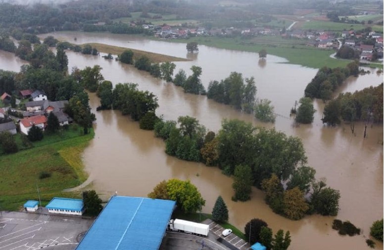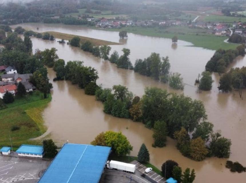 Poplavljeno je selo Jurovski Brod u Karlovačkoj županiji, u blizini granice sa Slovenijom. Fotografiju koja iz vazduha pokazuje kakvo je stanje u selu, objavili su vatrogasci DVD-a Jurovski Brod.