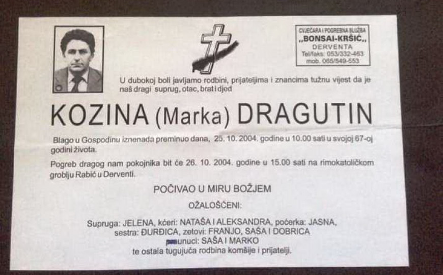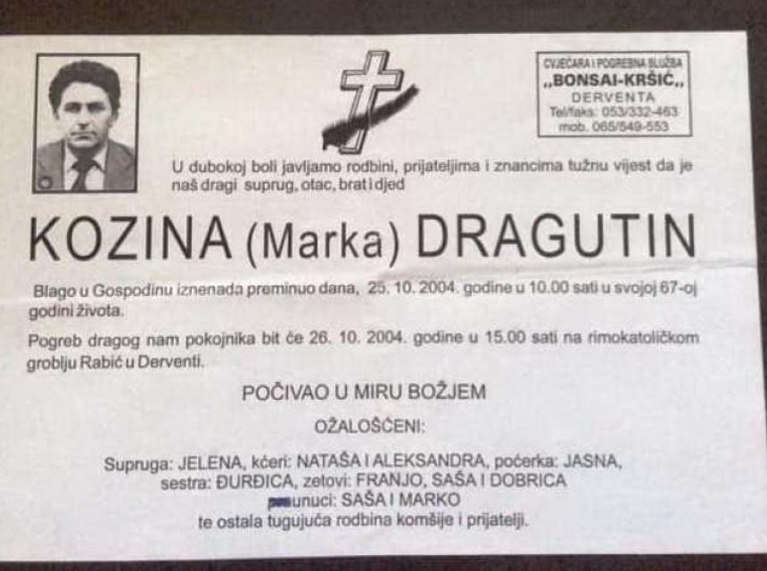 Pronašli smo i smrtovnicu na kojoj je vidljivo da je Dragutin Kozina u 65. godini umro 25. 10. 2004. i da je sahrana obavljena dan kasnije na rimokatoličkom groblju Rabić u Derventi.