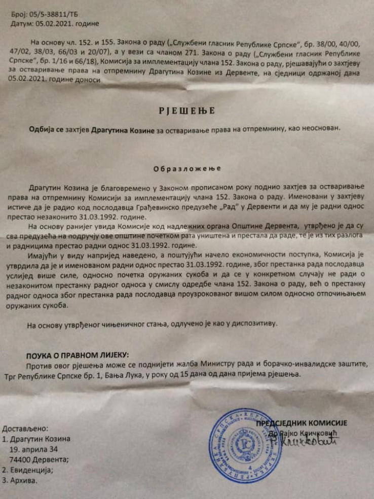 Dragutin Kozina iz Dervente je u zakonskom roku podnio zahtjev za ostvarivanje prava na otpremninu Komisiji za implementaciju člana 152. Zakona o radu prije nešto više od 16 godina.
